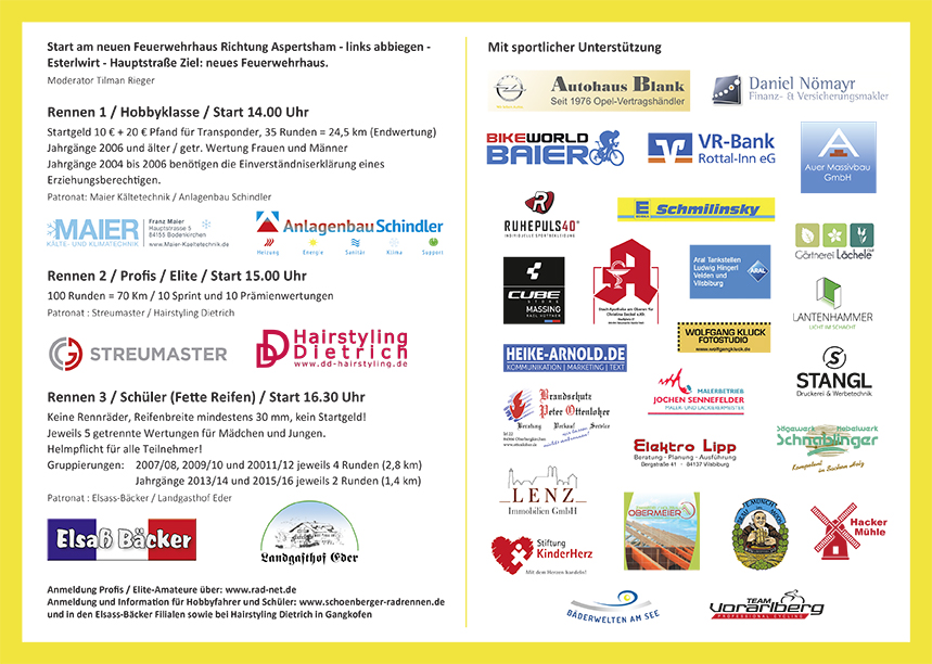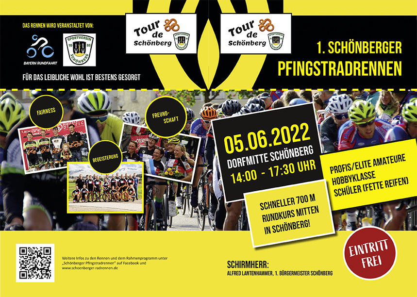 1. Schönberger Pfingstradrennen. Auf einem schnellen Rundkurs mitten durch Schönberg können sich Profis und Elite Amateure ebenso beweisen wie Hobbyfahrer und Schüler (fette Reifen).