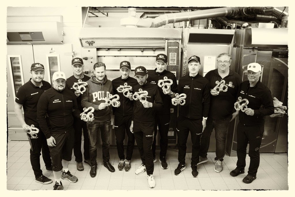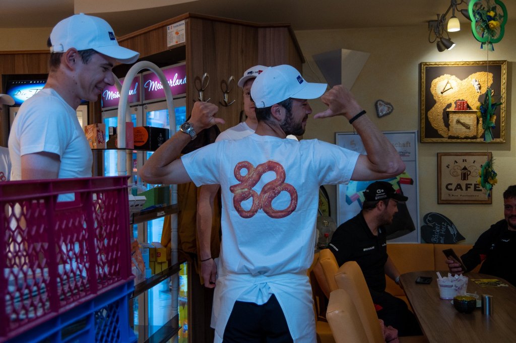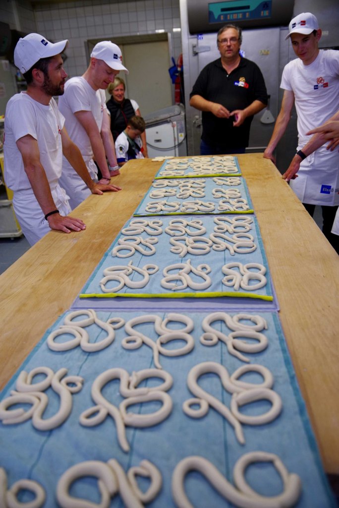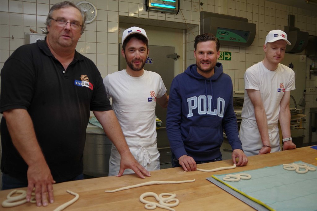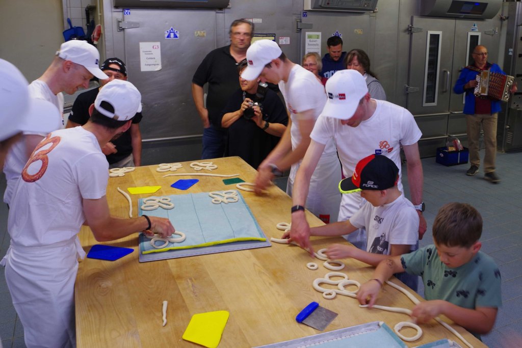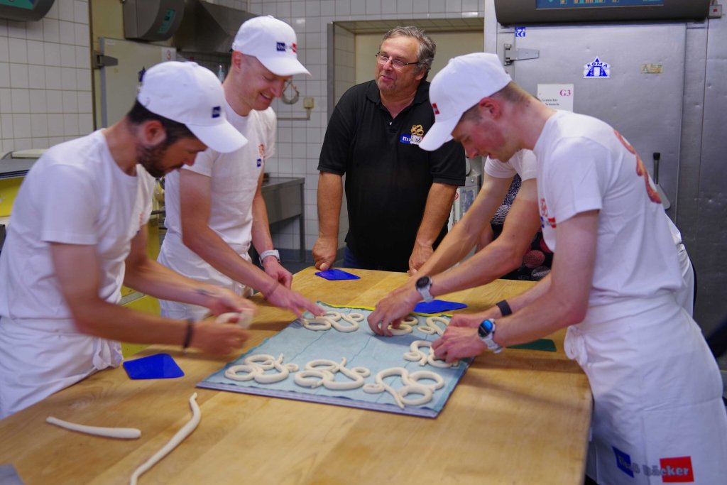 Der Schönberger Elsaß-Bäcker ist nicht nur ein leidenschaftlicher Fahrradsportfan und als solcher der Hauptinitiator und Organisator des „Schönberger Pfingstradrennens“, das 2022 am 05. Juni zum ersten Mal stattgefunden hat (Fotos und Berichte folgen); der „Bäcker mit Herz“ versteht es auch, die teilnehmenden Radprofis dahingehend zu motivieren, sich selbst einmal als Bäcker zu versuchen! Gemeinsam entstanden so in der Elsaß-Bäckerei in Schönberg die ORIGINALEN, von Toni Jung erfundenen Radl-Brezn, die prächtig gelangen und allen bestens geschmeckt haben.